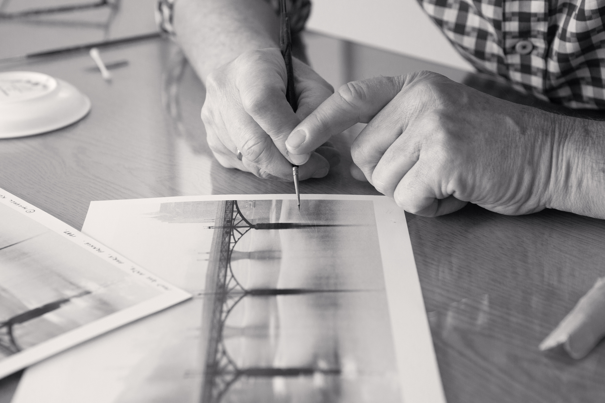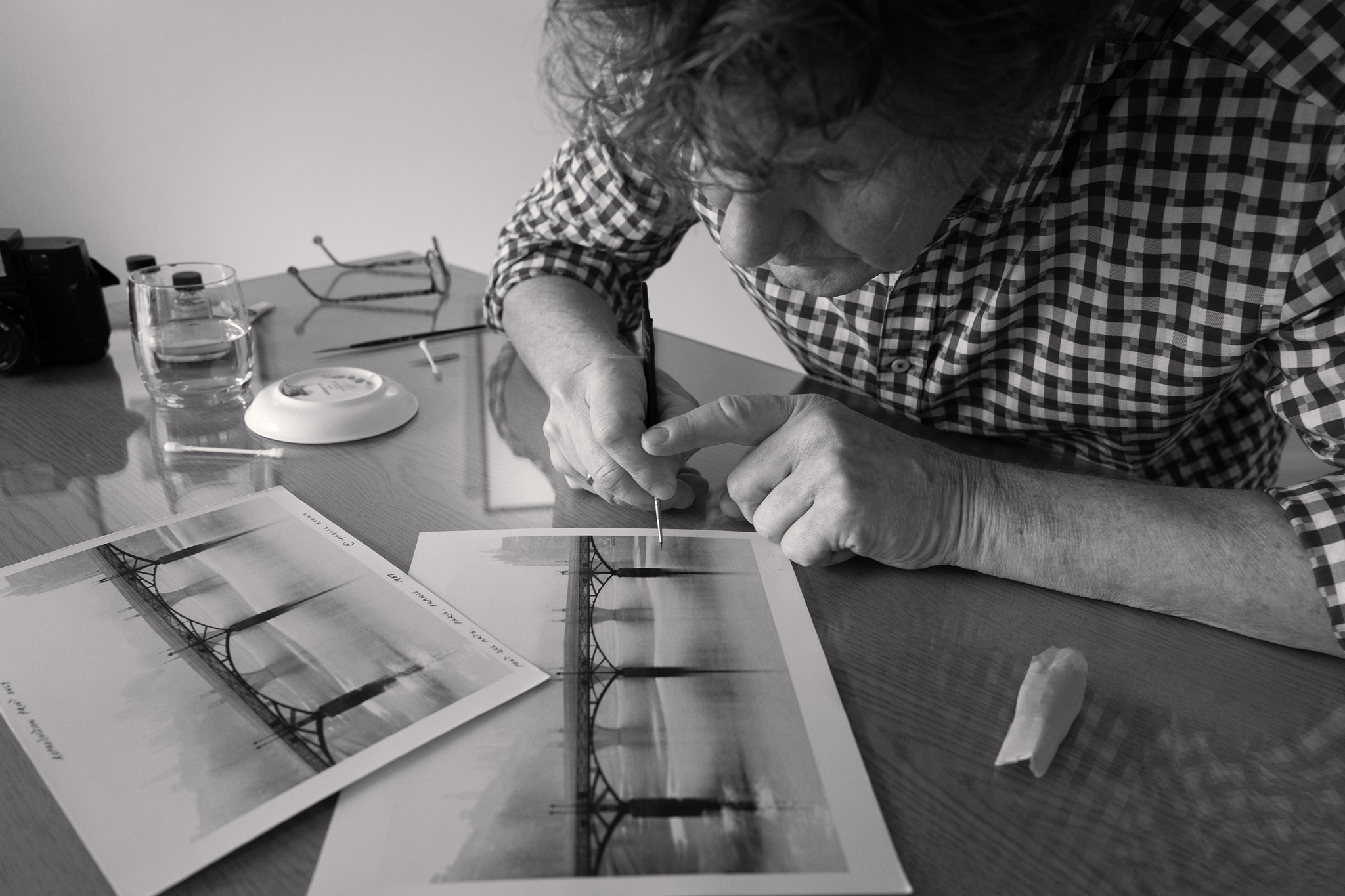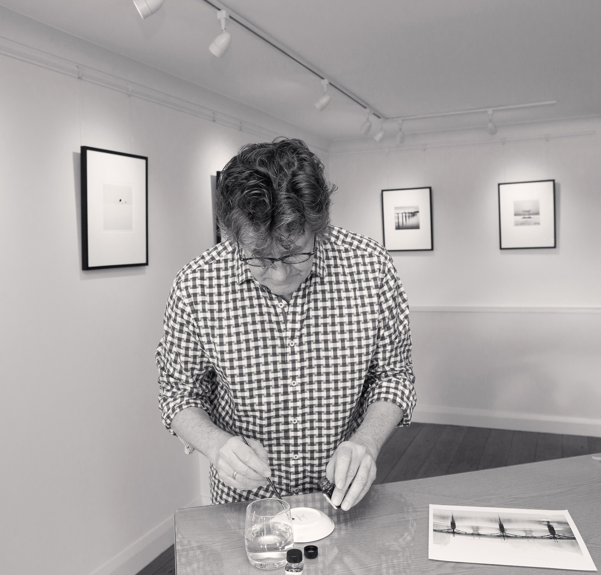 I watched Michael Kenna retouch a print by hand in my gallery in Bosham in 2019 during an exhibition of his New & Rare Works, and it was like seeing magic! The retouching process was so extraordinary that I joked with Michael that he had turned the gallery into a scene from Hogwarts. At any moment I expected Dumbledore to walk in! Unless one experiences retouching in person, I don’t think it is possible to appreciate the skill and patience required to make adjustments to the surface of a silver print with fine paint brushes and retouching dyes. The print in question was Pont Des Arts, Study 1, Paris, France, 1987 and a small speck on the surface of the silver gelatin print needed to be retouched.