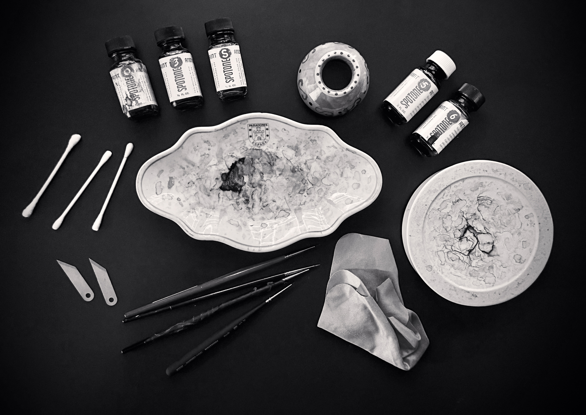 Retouching dyes come in different colours and need to be matched to the different areas of the print - warm in the highlights and cold in the shadows for my prints. Occasionally, black spots appear on the print from tiny holes in the emulsion of the negative. These are a bit more troublesome and need fine etching with a scalpel blade.
