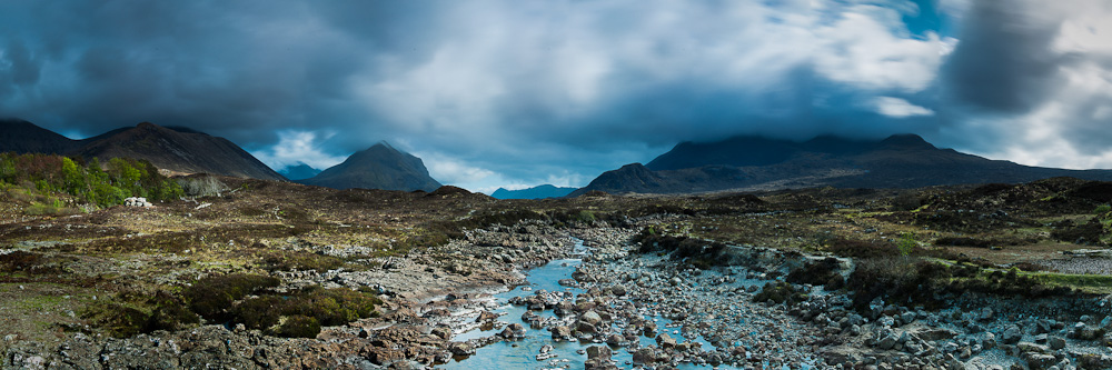 To experience such pristine beauty, along with deserted beaches is what makes landscape photography on Harris so special. These moments certainly more than make up for all those cold nights spent in tents waiting for the light!However, by the next morning it was time to pack up my gear for the return ferry crossing to Skye. I still had 24 hours left on Skye before heading home, so I was hoping for a final evening shot at one of my favourite locations, Elgol on the west coast of Skye. I had also hoped to get a shot at a place called Glen Brittle, but when I got there, the cloud was too low and the light too flat to produce anything I was happy with. So on my way back, I passed Sligachan. Once again this is a location, which we often see photographed, most often with the bridge in the foreground. As I drove past, I noticed that heavy dark clouds were moving across the sky in the wind and the contrast of the sun in the foreground with the clouds over the mountains had potential. I stopped and got this image, which I hope is a bit different from what we normally see. I’m still not sure if I really like it, but I think it looks better in print form when enlarged to 80cm or more.