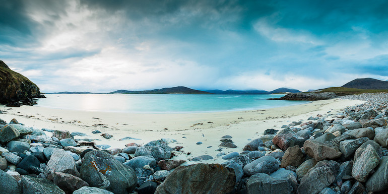 Throughout my time on Harris, I would find that one minute I was driving along the single track roads and then, just round yet another bend, there would be a new photo opportunity. Often made through a combination of the raw beauty of the landscape and the weather systems moving rapidly across the sky. Its just as well there are a lot of laybys to park in! The first evening, I had planned to go to a beach called Seilebost hoping to see whether a sunset might develop. In fact, as I drove to the location, the weather was worsening by the minute. It was beginning to rain and big banks of grey cloud were moving in. By the time I got there, the rain had stopped, but the cloud remained. However, as mentioned earlier, I was keen to see what developed and it’s always good to be in such beautiful places, no matter what the weather.