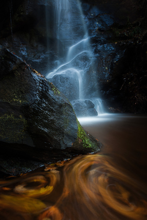 Murk Illuminated: I should include a waterfall shot as they are very much "my thing", I love their ever changing character. This was shot recently at Roughting Linn in Northumberland, just over the border from where my parents live. Amazingly there's a road that crosses the stream just a few feet back from the top of the image but this waterfall seems little known - I grew up within miles of it and didn't know anything about it (too many games of Elite perhaps!). I took the wrong route in and had a bit of a scramble down a rather slippery cliff to get here. In the pool at the bottom are many fallen trees and branches, so there are relatively few compositions to work with, but as soon as I saw these leaves swirling in the foreground (something of a motif in my waterfall shots) and the lovely winding fall, I was sold.
