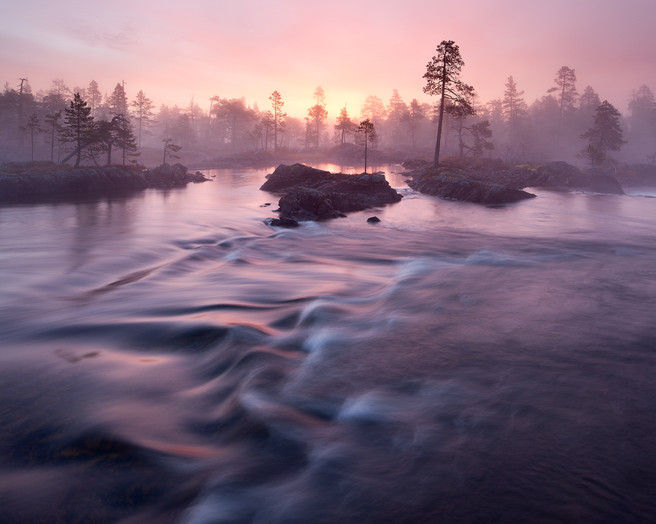 This was one of those mornings you don’t get very often. The image is made in an area called Trollforsen which is a beautiful area of rapids in Lapland in northern Sweden. I had scouted this spot along the river the evening before and walked there in the dark early the following morning with the hope to catch the first light. When I got to the spot it was still dark but I was pleased to see that there were some fog on the other side of the river. As the sunrise approached there was this beautiful glow of red in the sky. What I really love about this image is the background with all its details and the depth that the fog creates. It’s an image that I’m very pleased with.
