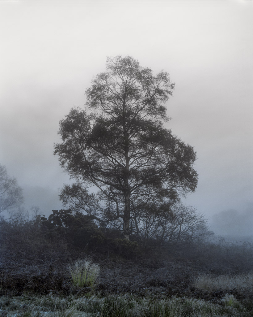 Birch with grass in fog