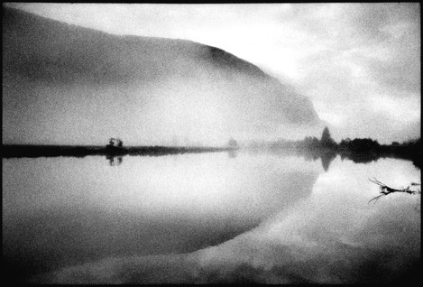 This one was early in what was a grey, misty and dull morning. It was taken by the side of a road which was still very quiet. I was still stiff and cold from sleeping in the car, and I had been bitten to death by midges the day before. I had to stand on a small rock to get as high as possible, and I couldn’t tilt down any further because the lower bank of the river-cum-marsh would have crept into frame, so I knew the composition was going to be top heavy, yet something was telling me it would work. And it did. It is my favourite combination – an uncomfortable, weird composition, which still works perfectly. The grey drabness meant I knew I’d have to push the negative and make the mist as white as possible. The remaining land and water are so magical – I have spent hours getting lost in those shapes.