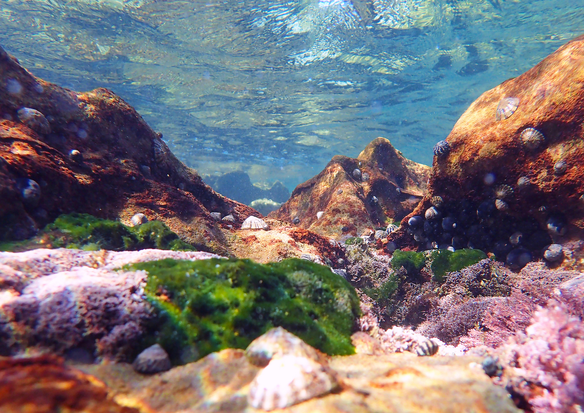This image was taken at Little Bay and was shot in less than ten centimetres of water. The shape of the rocks and green algae give it a sense of mountains and fields, and the reflective colour of the water is enough to pass as the sky. Beyond the immediate formations, there are distant mountains layered in faded tones. It has a great depth of field and is very deceptive. Every time I look at this image, I see mountain ascents, long hikes and adventure.