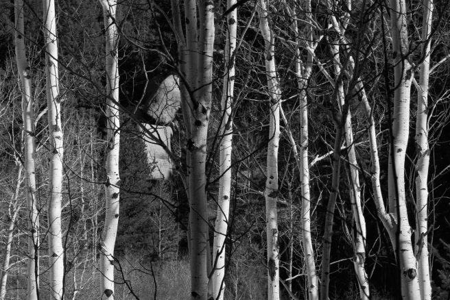 Driving home from a trip to Wyoming, I saw these roadside aspens. All perfectly straight and several layers deep. The formation and different sizes created depth. The youngest aspens in front are barely tall enough to make it.