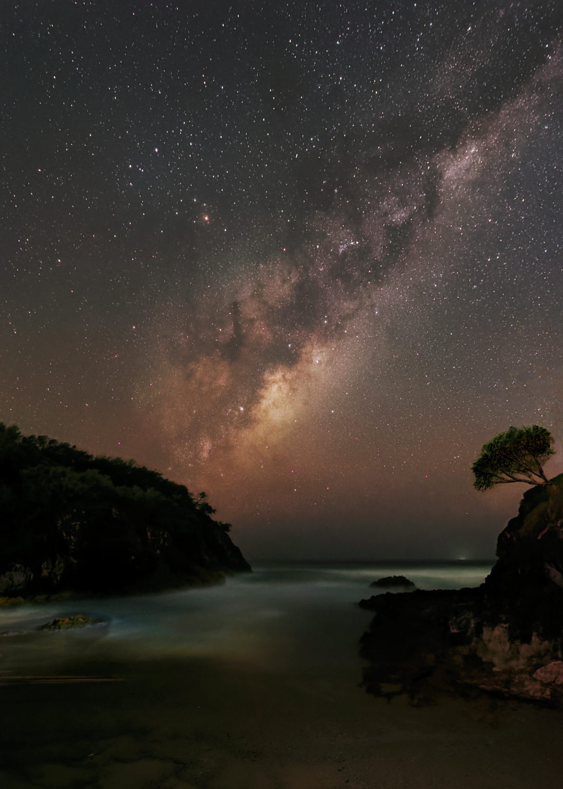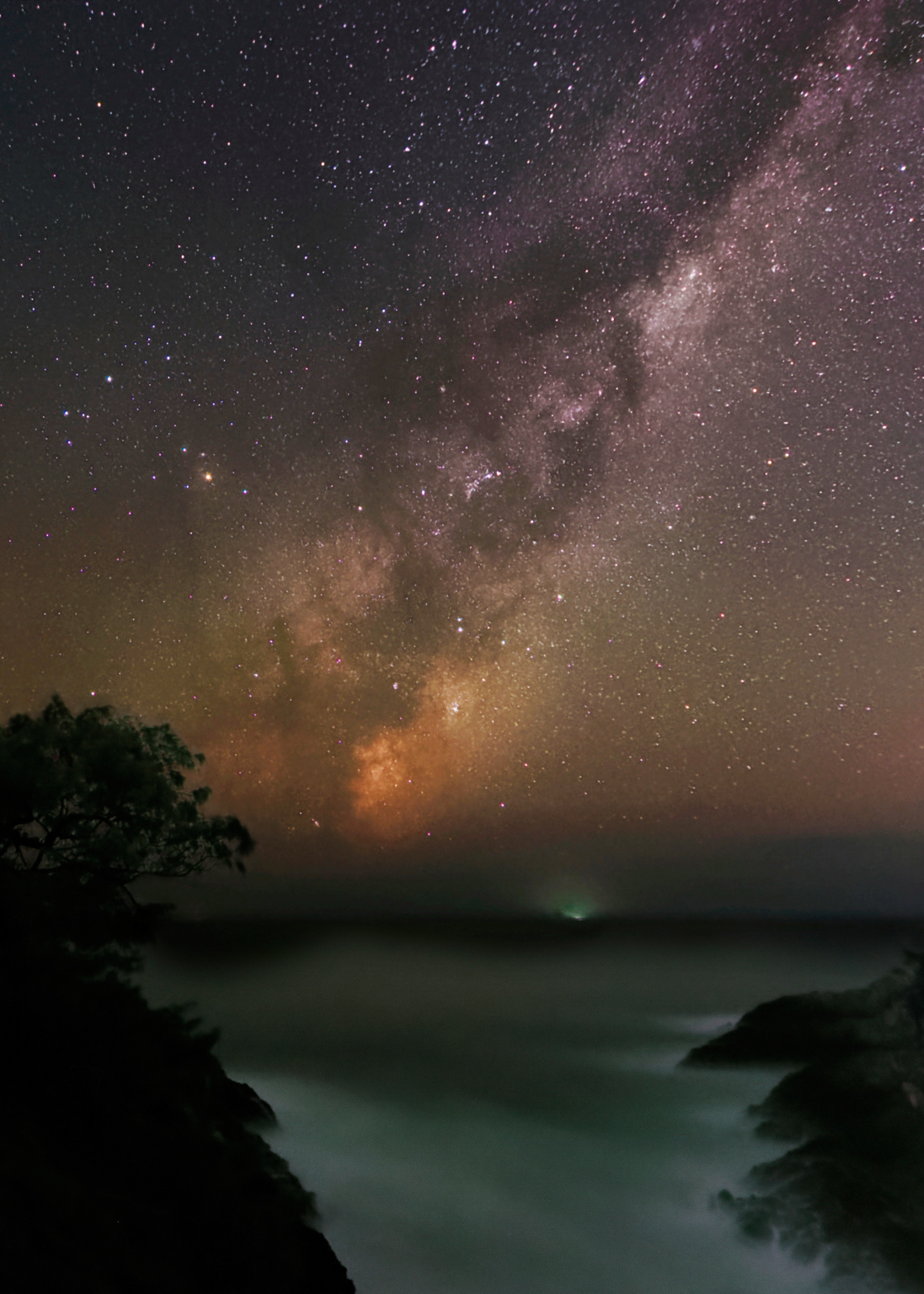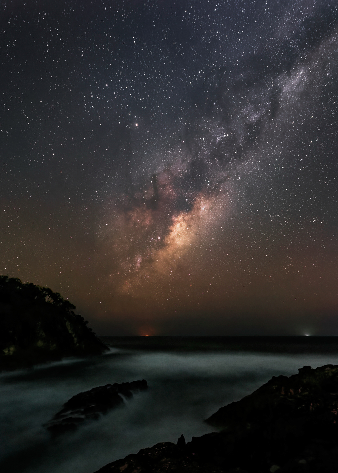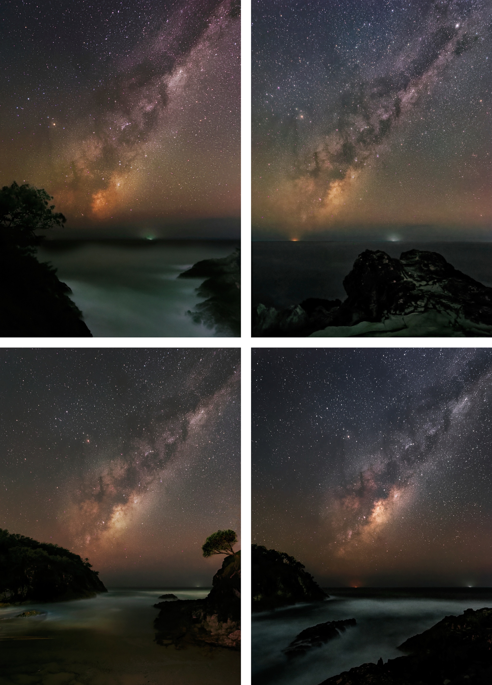 Straddie (North Stradbroke Island, Queensland) is my go-to place. I have walked countless kilometres here and enjoyed every step. The two Point Lookout gorges are one of the best areas to visit, where Humpback Whales pass by twice a year, big waves crash into the coastline and there is a sighing blow hole to create atmosphere. Point Lookout and the gorges is also one of the most visited areas of the island and countless photographs abound. Unfortunately, most are predictably similar. The opening of the gorges reveal open sea and not much else. Negative space if you will. Unfortunately, this space does not add to any photo unless there is some spectacular event such as a whale breaching close in. This has occupied my mind for some time, until I realised that there is approximately a two-week window where the Milky Way rises in the opening of the gorges. A series of four photos slowly entered my mind.