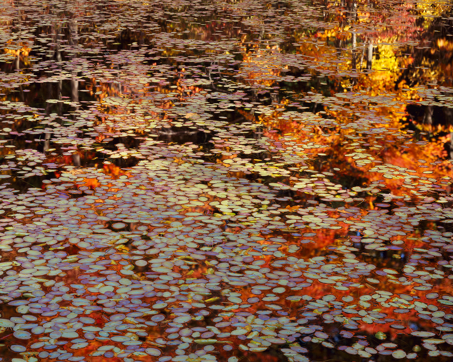 A particular meadow that Wawrzonek came upon near where Thoreau's cabin had been was a revelation. "When I stumbled on Wyman's Meadow, I went bananas." he says. What he found there was a vernal pond (a temporary shallow pool) with violet and green Water shields floating on the surface. Water shields resemble Lilies but are actually a different species. Orange and yellow reflections from the sun and trees behind the pond added a beautiful glow complementing the water shields. Wawrzonek shot a whole box of sheet film that day. Although he returned many times over the next 10 years, those conditions never recurred.