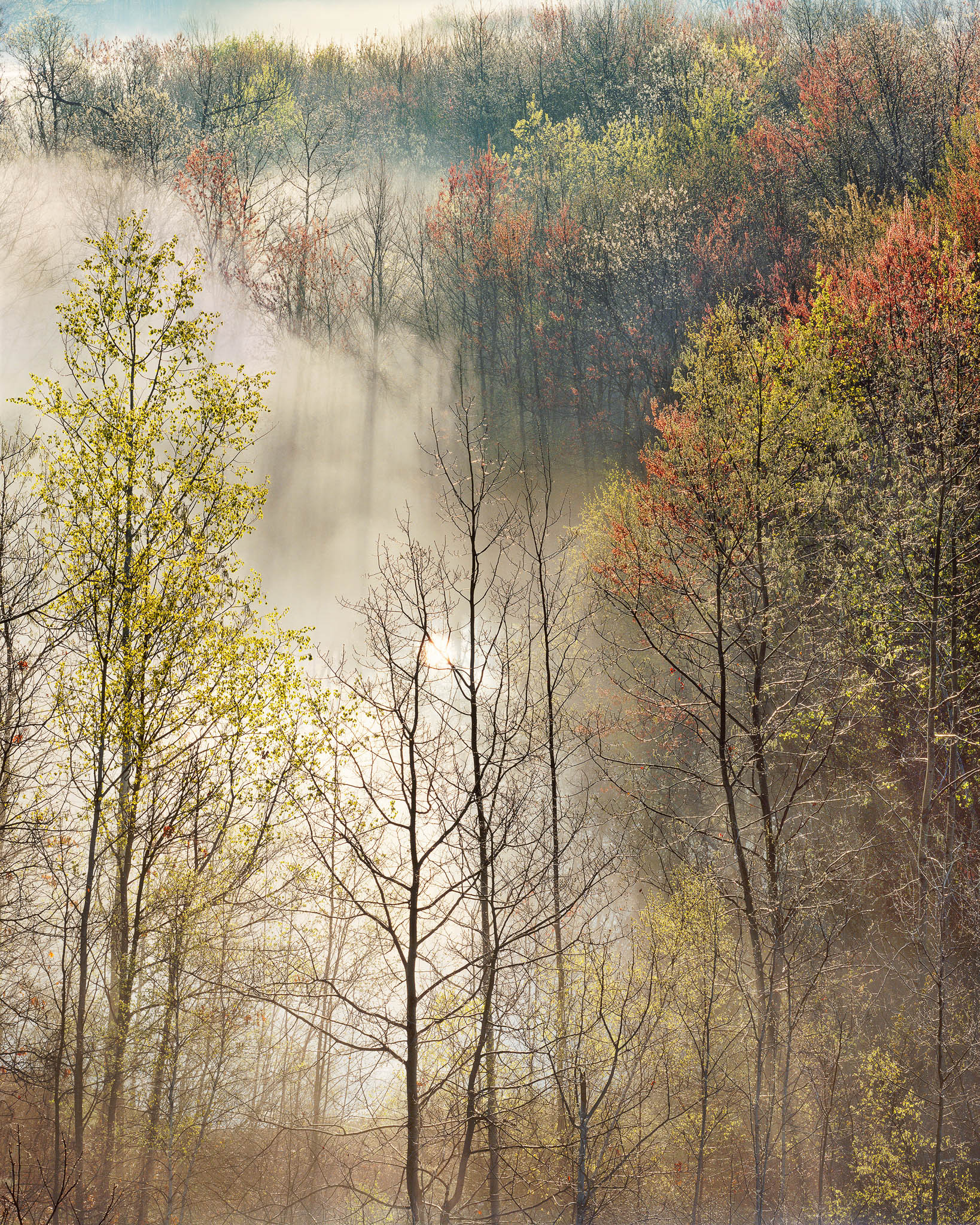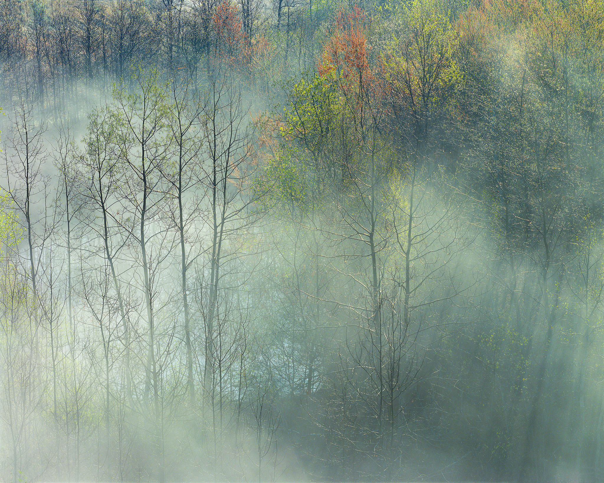 Wawrzonek experienced a breakthrough one day in the Spring of 1981 when he discovered a particular view of some trees. "It happened that the only place to photograph these trees was from elevated portions of Interstate 90 a few miles west of Boston. This was a unique vantage point that placed me as high as the tree canopy as well as close enough to photograph. The trees in early spring became a pointillist ensemble of buds of various colors, some as brilliant as leaves in the fall."