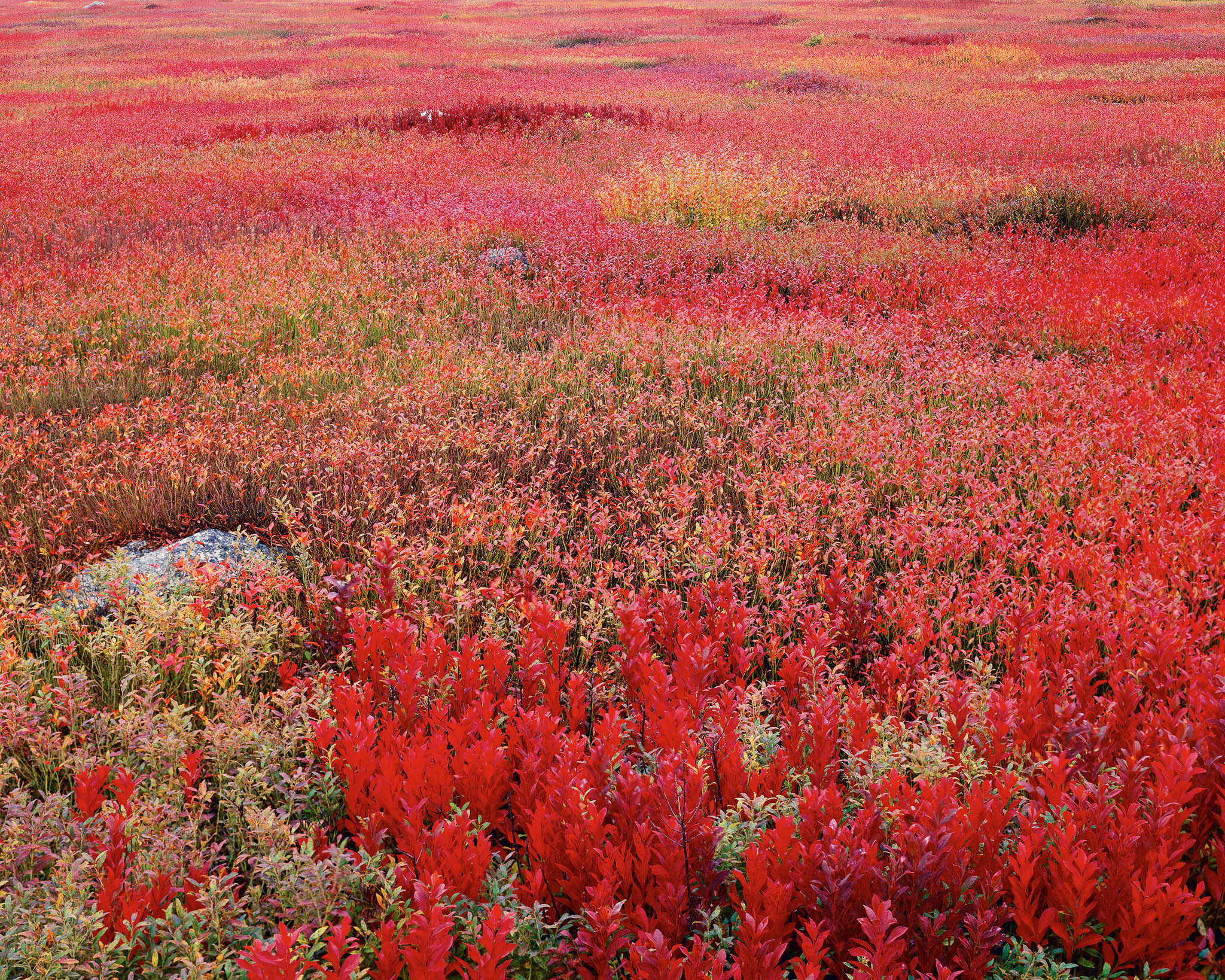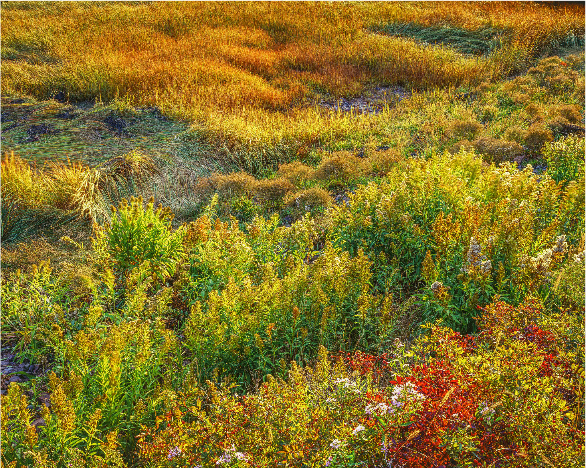 Another vernal pond, Upper Hadlock Pond, beside a road in Acadia National Park in Maine, was also a favorite location. Wawrzonek discovered it on his first trip to Maine and visited it whenever he returned. It contained a patch of yellow, orange and green reeds that "has come to feel almost like family". It was windy on the day he found it. At first he was bothered by the wind, but then he realized the wind created "a kind of dance in which I participate." And on quiet days,"the reeds just line up to show their fall colors," reminding him of Monet’s haystacks.